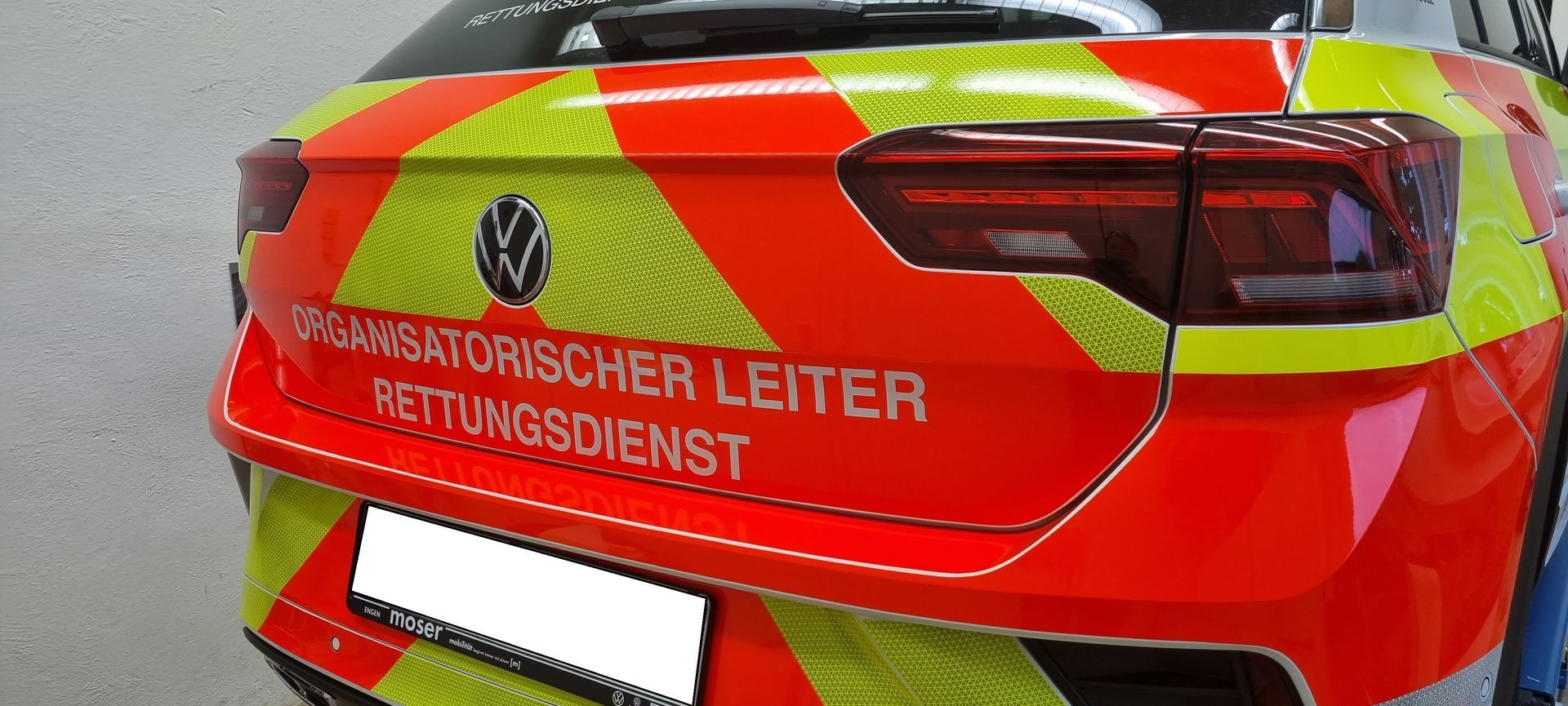 Da es sich bei einigen Einsatzfahrzeugen um Sonderanfertigungen handelt, wird das Fahrzeug komplett vermessen und die jeweilig gewünschte Beklebung auf Maß hergestellt.